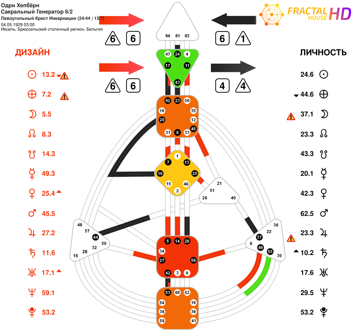 Согласно Дизайну Человека, Одри Хепбёрн относится к типу Генератор, но вот с профилем есть вопросы, т.к.время рождения попадает на стыке 6/2 и 6/3. С одной стороны она ни раз встречалась с вызовами в жизни и стойко их преодолевала, с другой она такая хрупкая и неординарная, изящная...
