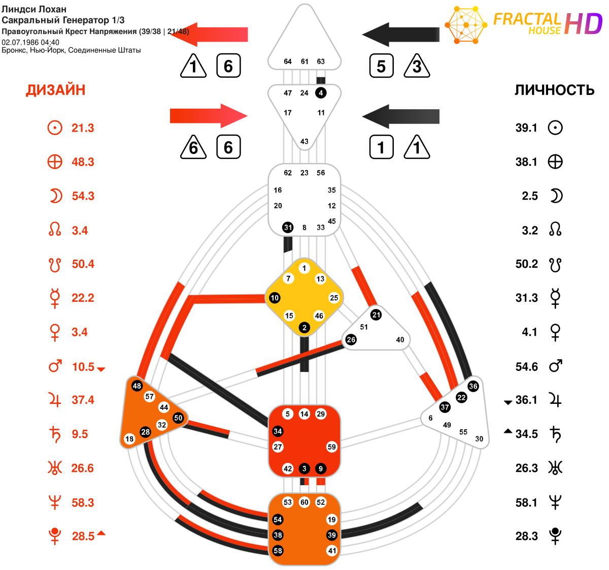 Ее часто упрекали в безответственности (опаздывала или пропускала сьемки), она ни раз была участницей ДТП и скандальных новостей, что уж поделать, если у тебя крест Напряжения и 39 ворота Солнца Личности. Все это сочетается с каналом борьбы 28-38, каналом Исследования 10-34, часть которого в Марсе и другими не менее интересными активациями. Когда смотришь на Линдси, сразу виден озорной огонь и перчинка во взгляде.