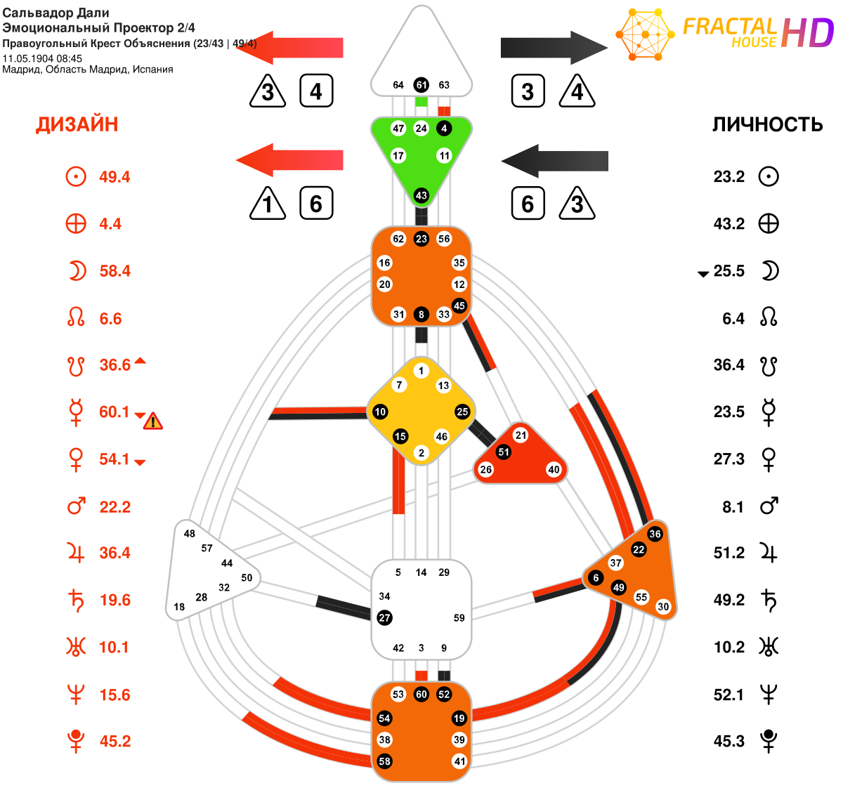 Он был уверен в своей Гениальности, мечтал превзойти всех и быть Лучшим, быть первым (эго определено каналом 51-25). «Зависть других художников всегда служила мне термометром моего успеха» - рассказывает Дали.