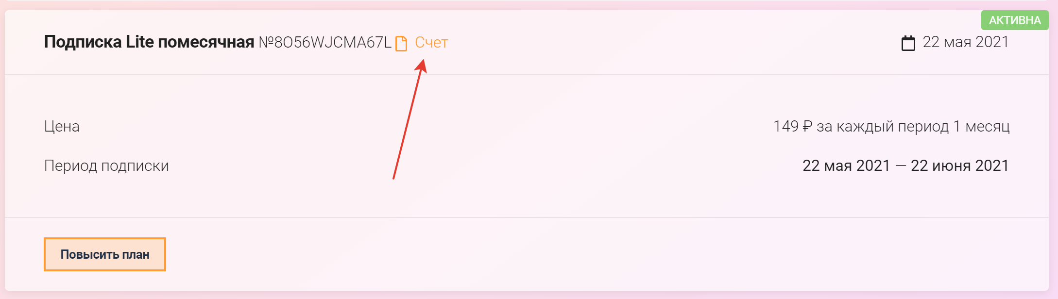Далее в заголовке подписки нажмите на ссылку "Счет"