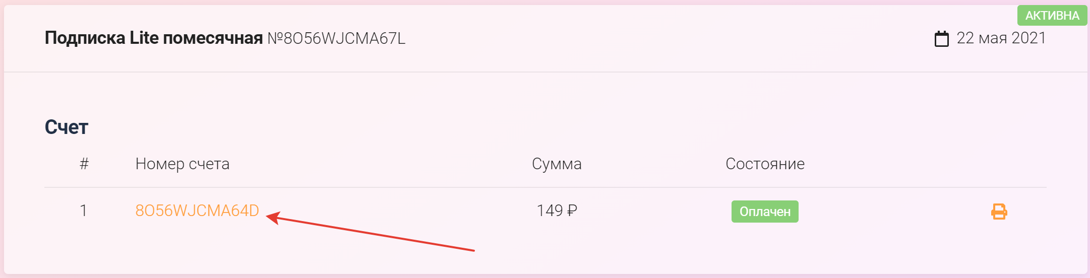 Далее вы увидите все счета оплаченные в рамках вашей подписки. Здесь вам нужно выбрать любой из представленных счетов:
